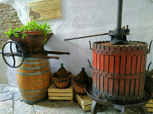 Sempre sulla parete destra è possibile ammirare un vecchio torchio e una botte con i quali veniva fatto e conservato il vino. Attrezzi che profumano di memoria e che, collocati in una Gaeta contemporanea, regalano ricordi di vite passate.